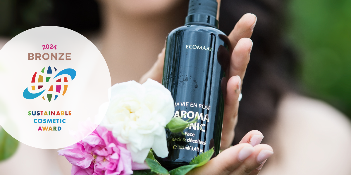 Earlier in 2025, ECOMAAT was also honored in Japan, earning a Bronze Award at the Sustainable Cosmetic Awards in Tokyo. The award was given for our La Vie en Rose Aroma Tonic — a certified organic floral tonic made from Rosa Damascena and Rosa Alba, distilled specifically for this formula using a zero-waste production approach.