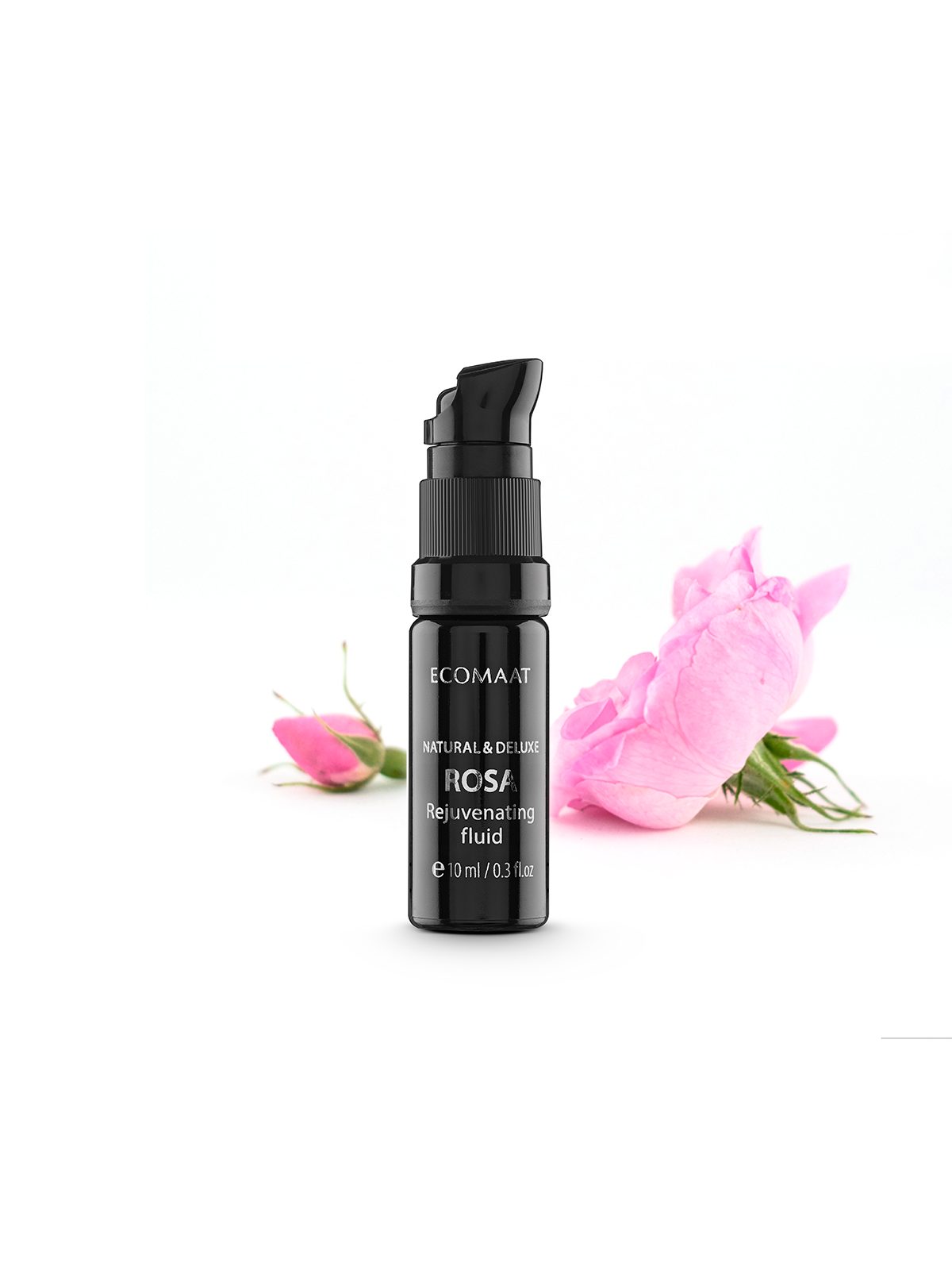 Apply morning and evening. Shake the vial well and then spray one, two to three Rosa face fluid doses on your palms. Rub on your finger and apply to the skin. For better hydration, apply on damp skin. The use of floral water Rose or La Vie en Rose Aroma Tonic of Ecomaat, just before application of the face fluid enhances product efficiency.